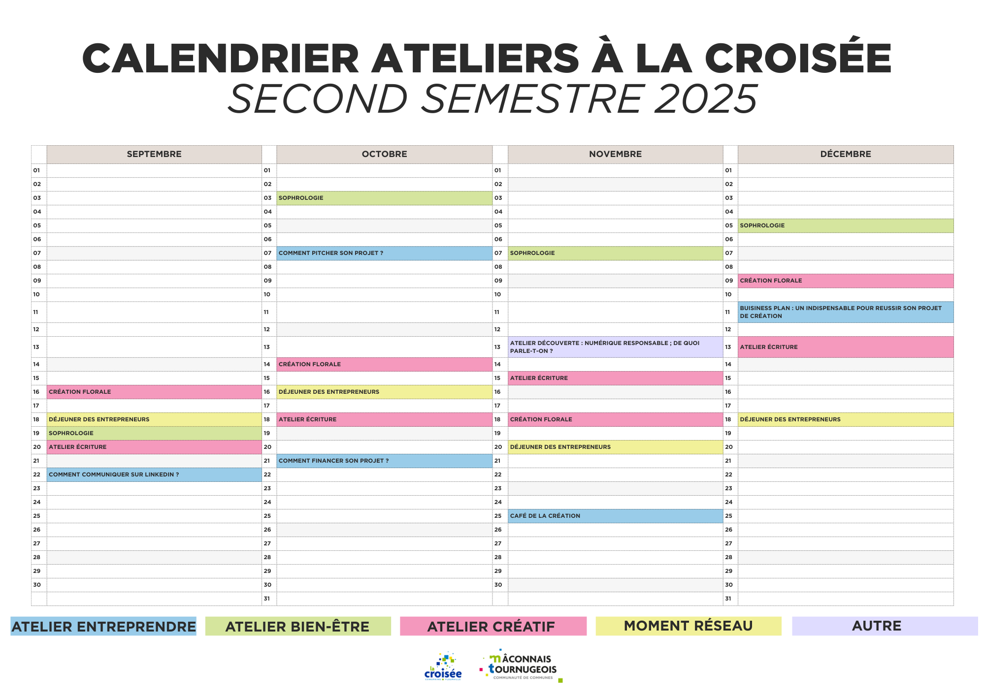 CALENDRIER ATELIERS – LA CROISÉE – SECOND SEMESTRE 2025